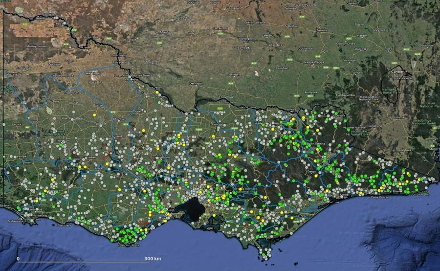 Figure 1. Results shown from EnviroDNA report of GAPS eDNA surveys from 1611 sites across Victoria. Site samples are indicated by a circle with green = detection, yellow = possible detection, grey = not detected. Predicted status of platypuses across Victorian river basins is also shown; green shading = widespread, yellow shading = restricted, grey shading = absent/unknown.